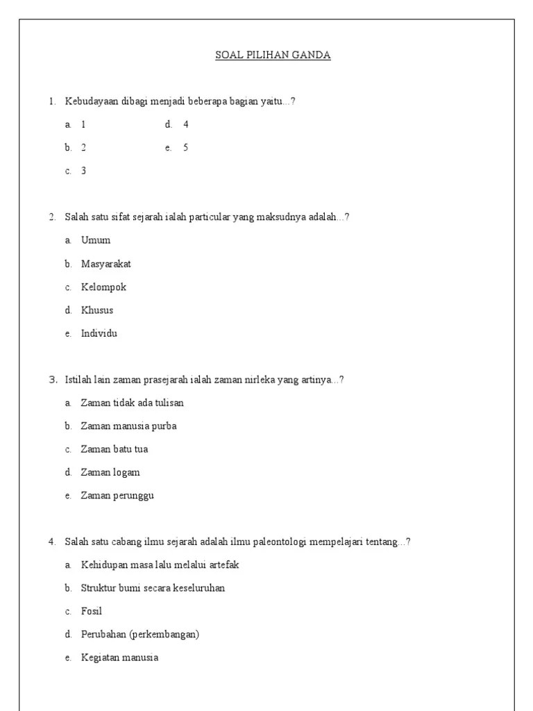 Fosil pithecanthropus erectus yang merupakan fosil manusia pertama di indonesia ditemukan di daerah. Contoh soal sejarah pilihan ganda dan jawabannya kelas x semester 2 1. Homo soloensis (manusia dari solo) c . Manusia purba indonesia bertahan hidup dengan cara. Berburu, menetap, dan mengolah hasil alam b.